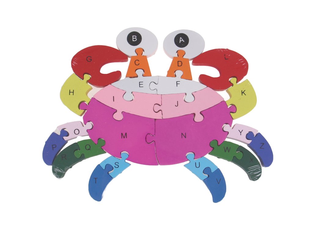 Barevné dřevěné puzzle ve tvaru veselého kraba přináší dětem radost z hraní i učení. Puzzle je oboustranné – jedna strana obsahuje písmena A–Z, druhá číselnou řadu 1–26.