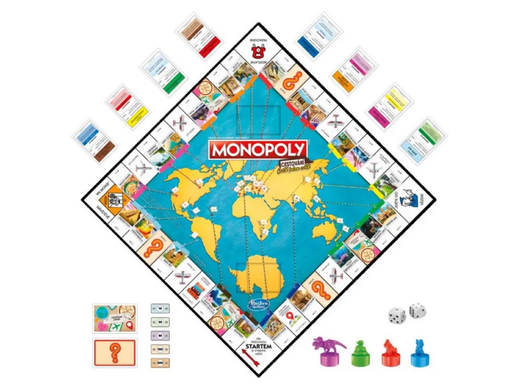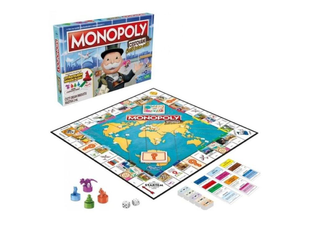 Monopoly: Cestování – Cesta kolem světa je zábavná cestovatelská verze klasické hry Monopoly, která vás zavede do nejznámějších světových destinací. Místo klasického kupování ulic budete objevovat památky, sbírat razítka do cestovního pasu a soutěžit o to, kdo procestuje svět jako první.